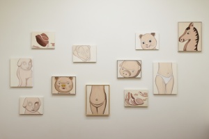 進化、効率、大量生産、加工、洗浄、商品価値を求めるのに伴う破壊、汚染。60、70年代日本高度成長下の幼少期の思い出とともにある様々な変化を、奇妙な生物、ペットとしての動物、おもちゃ、風景、折込チラシの無名の女の子たちや建売住宅のイメージを通して作品にしています。