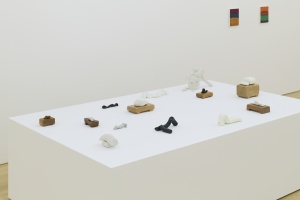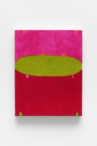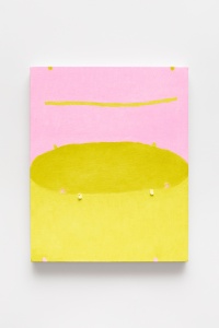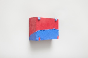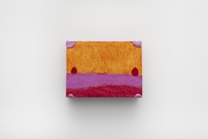 ピンク、オレンジ、イエロー、ブルーなどの鮮やかな色面に、小さい点や細い線の絵具の盛り上がりが物質感を表出させるペインティング。ぐにゃりと崩れ落ちそうな粘土を上から押し付け、ブロンズやアルミに鋳造した立体作品。