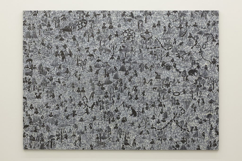 本展では、アクリル絵具とマスキングの手法を用いた作品を中心に展示いたします。幅6m近い4枚組の大作とともに、108点の40cm×40cmの小品により構成される壮観な展示、風能が新たに試みたグレーズの手法を用いた作品などが展示されます。また、2012年の小山登美夫ギャラリー(東京)での個展で、彼女は自身のインスピレーションの記録となるドローイング・ノートが初めて発表されました。その後も毎日3~5時間をかけて描き続けてきた、最新のドローイング・ノートを展示いたします。風能が持つ豊かな想像力、表現における新しい展開と挑戦をご覧下さい。