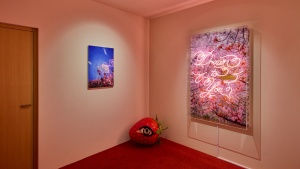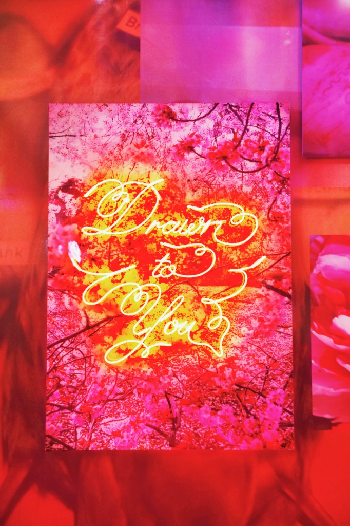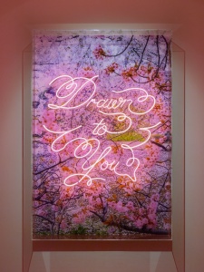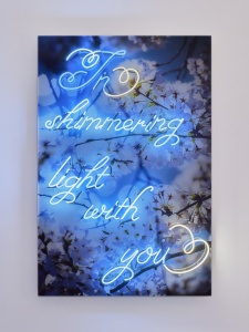 ネオン管を配した作品では、光まとう花々の写真に言語表現を重ねることで、蜷川が描くイメージをより強く打ち出しています。写真が写し取った自然光とネオン管の人工的な光が混ざり会うことは、自然との調和の中で歩む人々の姿にも重なるでしょう。
