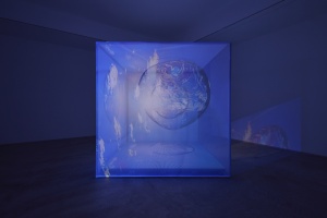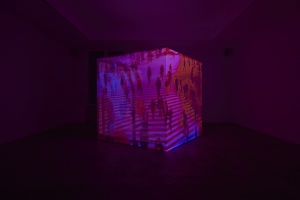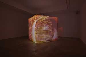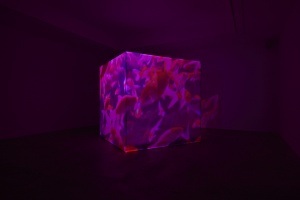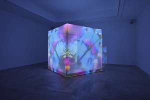 また本展における映像作品は立方体の空間内で体験して頂きます。床面と背面はLEDディスプレイ、壁面と天井部はプロジェクターによって映像が映し出されます。鑑賞者は茶室のような空間に座り、他者と映像体験をともにします。またそうした光景を少し離れたところから鑑賞することもできます。上映する作品は「胡蝶のめぐる季節」、「An eternity in a moment」、「Flashing before our eyes」となる予定です。