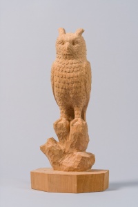 大竹は樟や檜、桂などを用い、彩色しない、素木仕上げの木彫作品を制作してきました。作品のモチーフは少女や鳥、動物が多く、すっと立つ凜とした姿勢や無表情ながらも深遠な強い眼差しは、まるで霊性をもつかのような神秘的な存在感を立ち表します。
