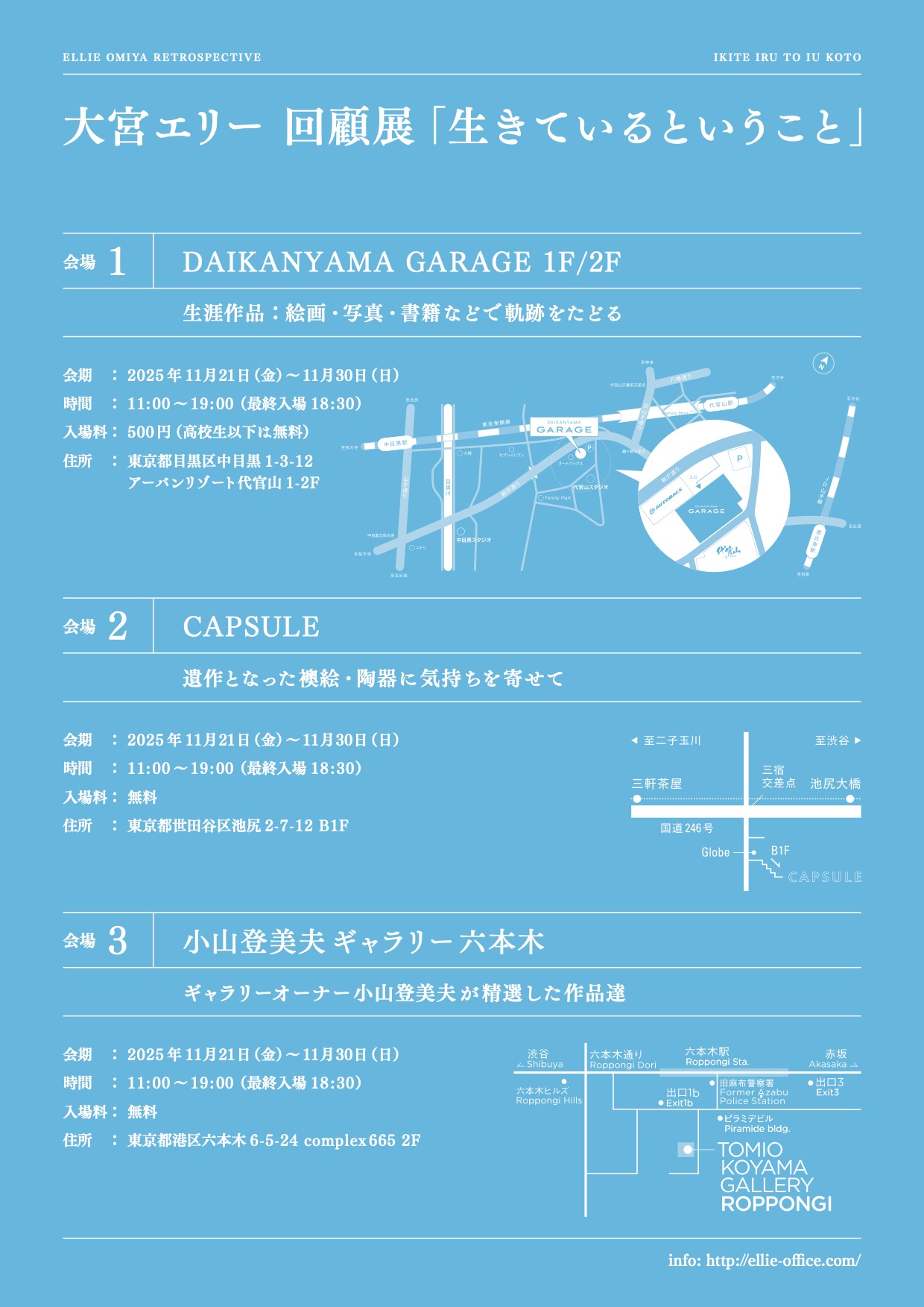 11月21日[金]より、彼女がその生涯で残した絵画・写真・陶器・書籍全1269点から厳選した作品を展示する、大宮エリー回顧展「生きているということ」。小山登美夫ギャラリー六本木、DAIKANYAMA GARAGE、CAPSULEの3会場にて同時開催致します。