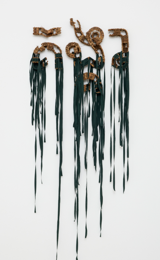 ギャラリーに足を踏み入れると、クメール語の「Mchas Teuk(水の主)」と「Mchas Dei(土地の主)」という言葉が訪れる人を迎え、これは迷彩布と撚り合わせて編まれた蔓によって制作されたものです。さまざまなプロルン(精霊)を想起させるこれらの言葉は、サムナンの新作を、アーティスト・ラン・スペース「Sa Sa Art Projects」を共に創設したアーティストたちと2022年にプノンペンで参加した、グループ展のタイトルと結びつけます。サムナンは今日多くの国において、地政学的な状況だけでなく、人と自然との関係にも劇的な変化が起きていると捉えます。土地や環境は、以前にも増して欺瞞に満ちた、不透明で、不安定な方法で管理されているのです。こうした不確かさや、私たちを不可視化してしまうような変化の背後には、何かが存在していると思えてならないと作家は言います。今日における土地や水の主は、いったい誰なのでしょうか?現代の人々は、人間と土地の祖先である「Nak Ta(ネアク・タ)」や超自然的な守護者である「Mrenh Kongveal(マレン・コンヴィアル)」といったプロルン(精霊)を、変わらず信じているでしょうか?