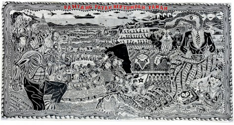 1998年、スハルト政権末期に誕生した学生たちの反体制運動から発展したアーティスト兼活動家集団、「タリン・パディ(Taring Padi)」の創設メンバーのひとりであり、2013年には横浜美術館でのグループ展「WelcometotheJungle」(熊本市現代美術館に巡回)に参加したムハマッド・ユスフは、新作の木版画とペインティングを展示します。