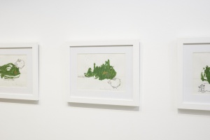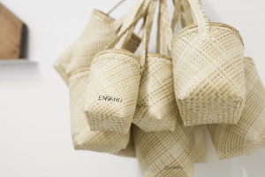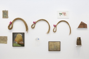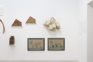 伝統的技法で作られ、東南アジア各国の旧名が書かれ束ねられた11個のバスケット、古代より東南アジアでの重要な植物であるタピオカの成分で作られ、タコが描かれた「Macan Organic plastic bag(虎のオーガニックなビニール袋)」、放棄された木材を使った山の立体作品や、ゴムの樹液を使ったペインティング作品、地図の上に土の点が無数に描かれた地図など。
