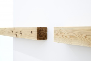 また、ギャラリーの奥の部屋の壁面全体に細長い木材を渡し、その一部を切り取り部屋の中央に置くインスタレーション作品を展開。全体と一部、ものと場の連関性を表します。