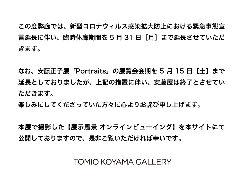 なお、アーティストや作品に関するお問い合わせはinfo@www.tomiokoyamagallery.comにて、プレスに関するお問い合わせはpress@www.tomiokoyamagallery.comにて随時受け付けておりますので、どうぞご遠慮なくご連絡くださいませ。