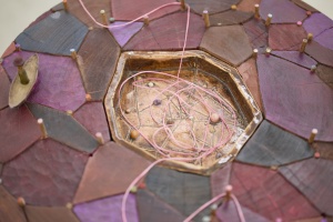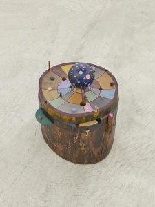 「思い出せない詩を育てる」シリーズの一つ「熱水泉の庭」では、水が張っているような丸太の断面に、人のような存在と球体が点在し、吊るされ、側面にも抽象的な絵画的な丸が描かれています。