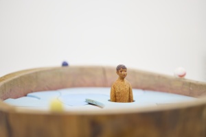 • Garden of Hot Springs 2024 h.90.7 x w.40.0 x d.33.0 cm wood, oil paint, stones, glass, ceramic, strings, metal fittings ©Keisuke Yamamoto
