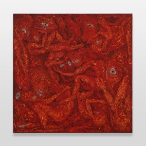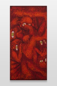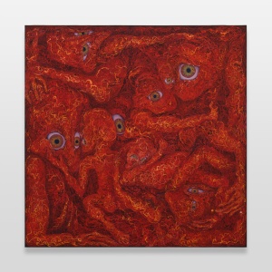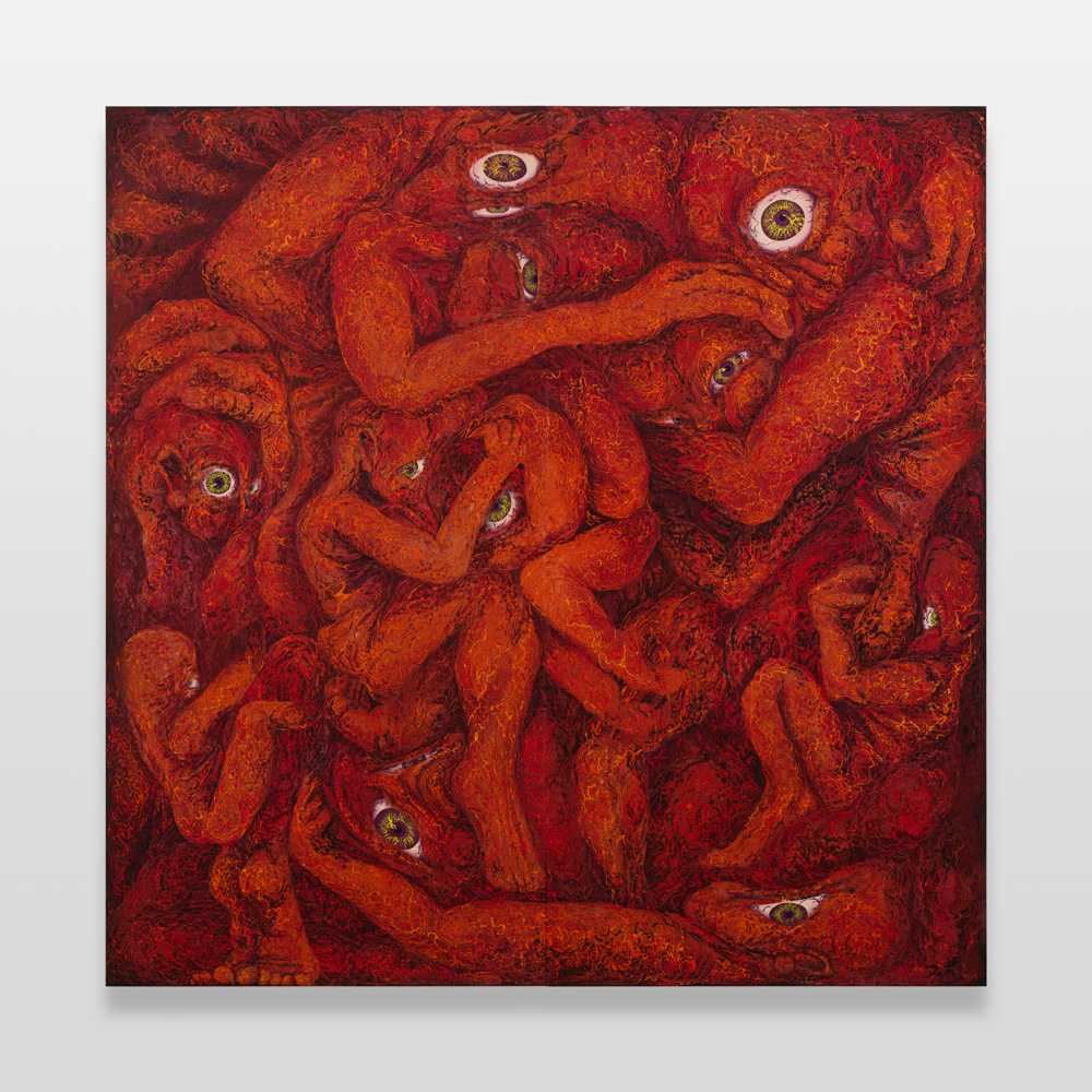 皮膚を持たない人間の唯一の部分である「目」を大きく見開いてこちら側を見ている人たち。何らかの空間に皆で固まりあって寄り添ってこちらを見ている様は、世界に出てくるのを待っていて期待と恐れをもっている赤子のような気さえしてきます。