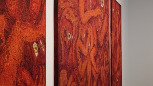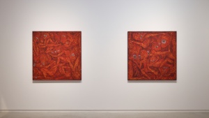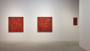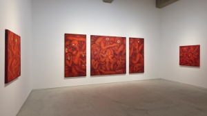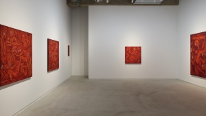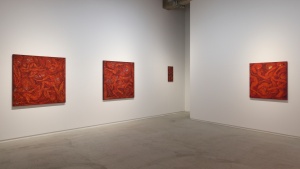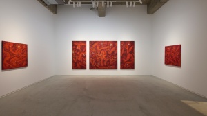 一見、ギョッとするイメージなのですが、染色ゆえなのか、ペインティングのような情念的なものはなく、赤という色も美しく目に飛び込んできました。