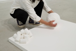 天王洲の「Wrapping Piece」 (1962/66年) は、鑑賞者が包帯を球体状に巻くことで、展覧会を通じて大きさを増していきます。この作品は参加者の行為によって発展し、手当、保護、覆うなどの行為の意味を喚起します。「Draw Circle Painting」 (1964年)では、来場者はペンで白いキャンバスに丸を描くことができます。本作も「Wrapping Piece」と同じように来場者の自由な参加を促す作品となります。
